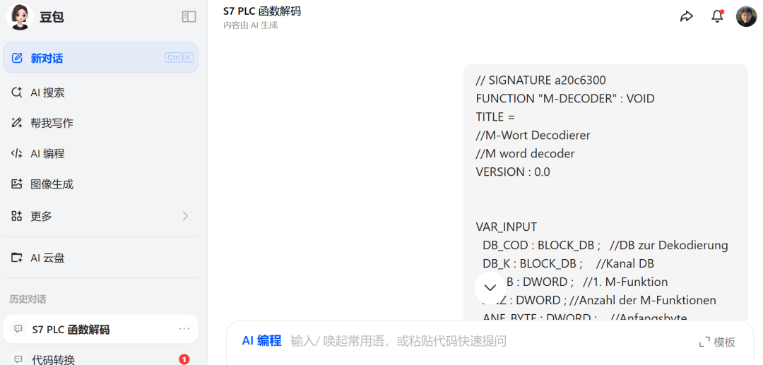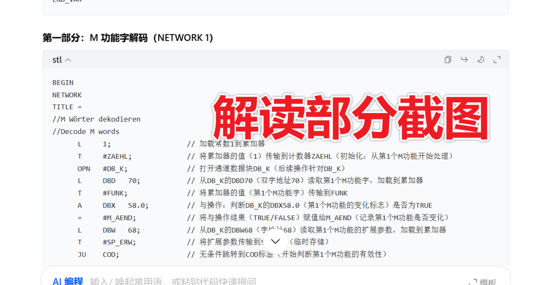 車間機床嗡嗡轉,老周卻盯著 Step7 軟件皺緊眉 ——FC105 功能塊里的邏輯像團亂麻,這個M150到底是怎么傳遞到 PLC里的,翻手冊半天沒搞懂。生產線等著調試,他突然想起:“聽易工說 AI 能解讀程序?試試!”